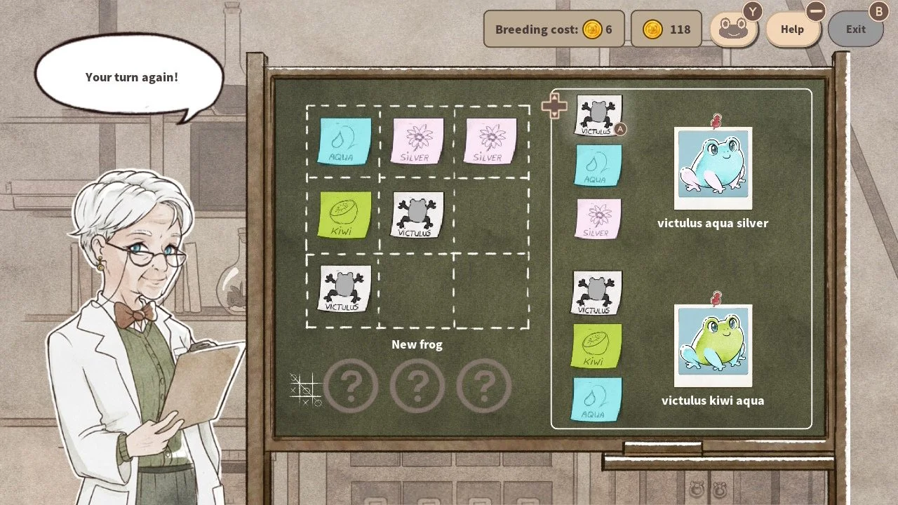 There are over 500 frogs to collect, with different colours, patterns, and variations. Rarer frogs are unlocked through a breeding mini game that plays out like noughts and crosses, encouraging experimentation rather than strict optimisation.